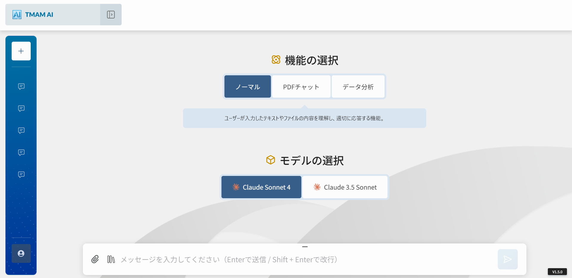 東京海上アセットマネジメントの社員専用の生成AIアプリケーション。Anthropic社のClaudeシリーズをはじめとした複数の生成AIサービスが利用できる。東京海上アセットマネジメントのAWS環境上に閉域網経由で独自に構築されており、UI/UXや機能まで幅広いカスタマイズが可能。