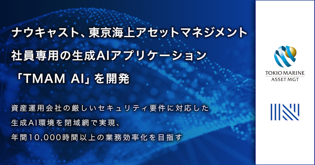 次世代金融インフラの提供を通して組込型金融を実現するFinatextグループの株式会社ナウキャスト(本社:東京都千代田区、代表取締役CEO:辻中 仁士、以下「ナウキャスト」)は、東京海上アセットマネジメント株式会社(本社:東京都千代田区、代表取締役社長兼CEO:長澤 和哉、以下「東京海上アセットマネジメント」)の社員専用の生成AIアプリケーション「TMAM AI(読み:ティーマムエーアイ)」を開発しました。資産運用会社ならではの厳しいセキュリティ要件に対応した、カスタマイズ性に富んだ生成AI環境を閉域網で実現し、年間10,000時間以上の業務効率化を目指します。