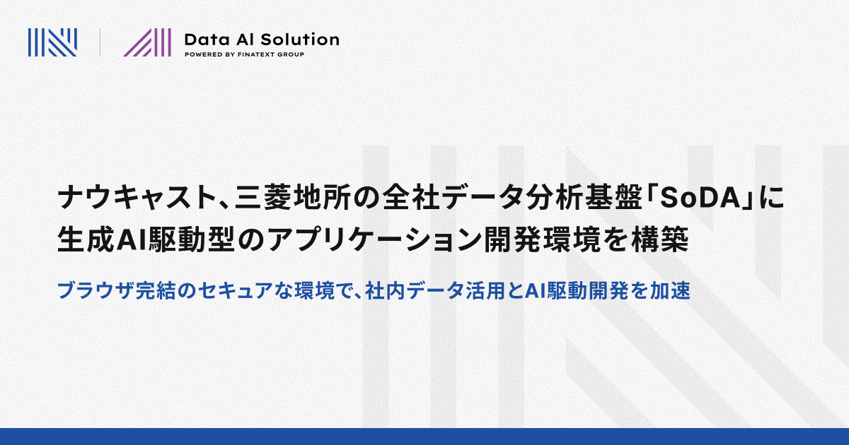 次世代金融インフラの提供を通して組込型金融を実現するFinatextグループの株式会社ナウキャスト(本社:東京都千代田区、代表取締役CEO:辻中 仁士、以下「ナウキャスト」)は、三菱地所株式会社(本社:東京都千代田区、代表執行役 執行役社長:中島 篤氏、以下「三菱地所」)の全社データ分析基盤「SoDA」上に、生成AIを活用したセキュアなアプリケーション開発環境を構築したことをお知らせします。