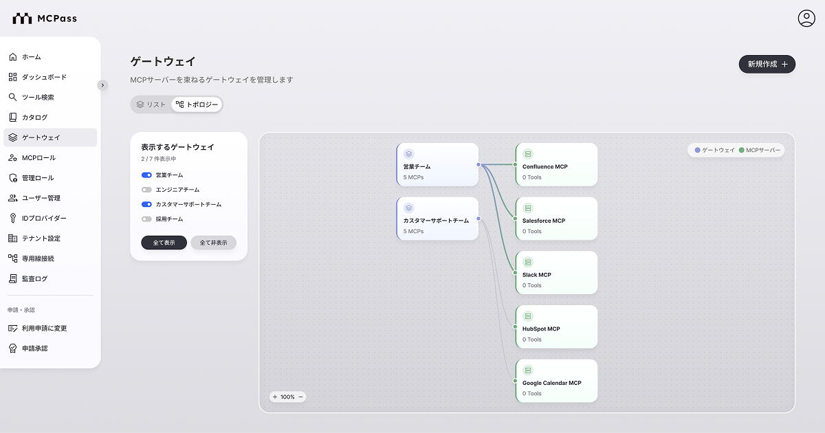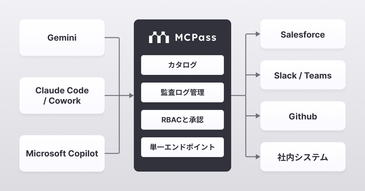 「MCPass」は、AIエージェントが業務システムにアクセスする際の認証・権限を一元管理し、すべての操作を監査証跡として自動記録する統制基盤です。単なる接続の仲介にとどまらず、「AIと業務システムをつなぐ」と「つないだ上で統制する」を両立します。