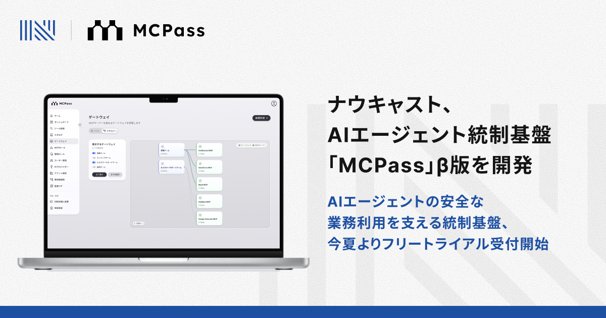 次世代金融インフラの提供を通して組込型金融を実現するFinatextグループの株式会社ナウキャスト(本社:東京都千代田区、代表取締役CEO:辻中 仁士、以下「ナウキャスト」)は、AIエージェント統制基盤「MCPass(エムシーパス)」β版を開発したことをお知らせします。2026年夏よりフリートライアルの受付を開始する予定です。